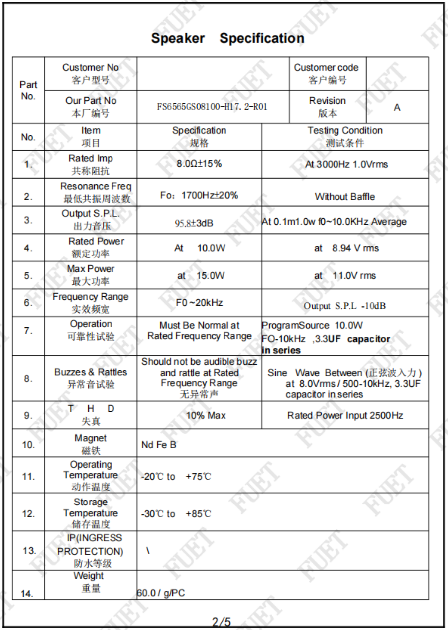 | 最低共振周波數(shù) | 1700Hz±20% | Without Baffle |